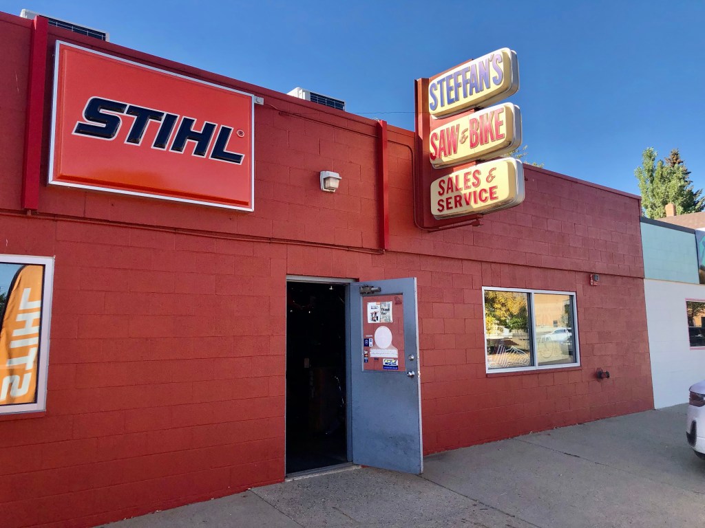 In Dickinson, North Dakota, I locate a chainsaw/bicycle shop conveniently located next to a grocery store. One stop shopping.