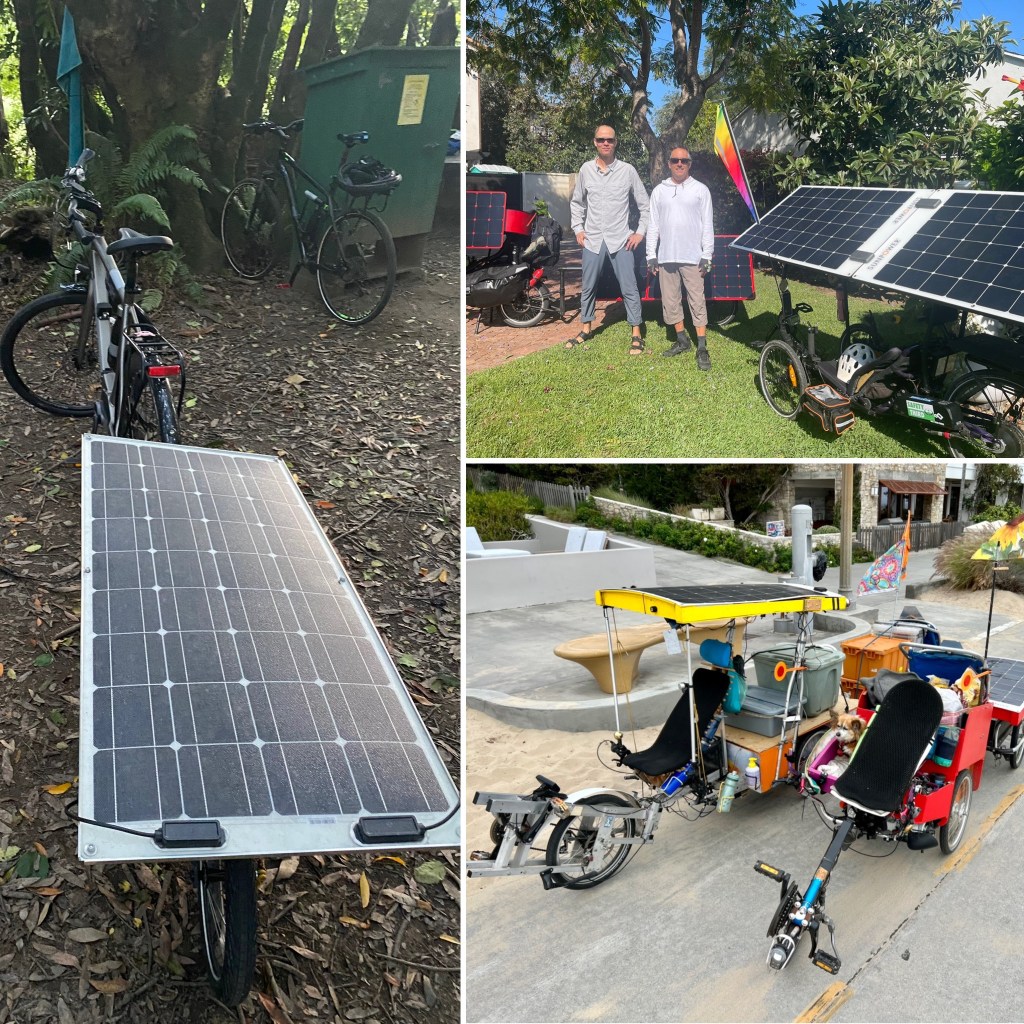 In the first week, I encounter four other solar bikes. The first two are a couple traveling with a dog on their custom trikes. They pull up next to me on the beach path in Los Angeles and declare, “Hey, we know you from the Grin profile video on YouTube!” I feel famous. Briefly.