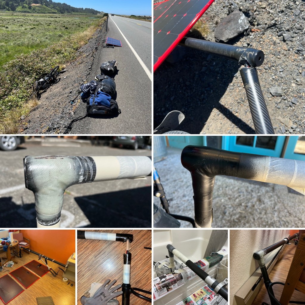 The bike lands tire side up. I check for injuries and amazingly, I am unscathed. The bike appears to be mostly intact but the loud crack I heard was my carbon fiber trailer snapping in two. I will not be able to ride away from this with the trailer in tow.