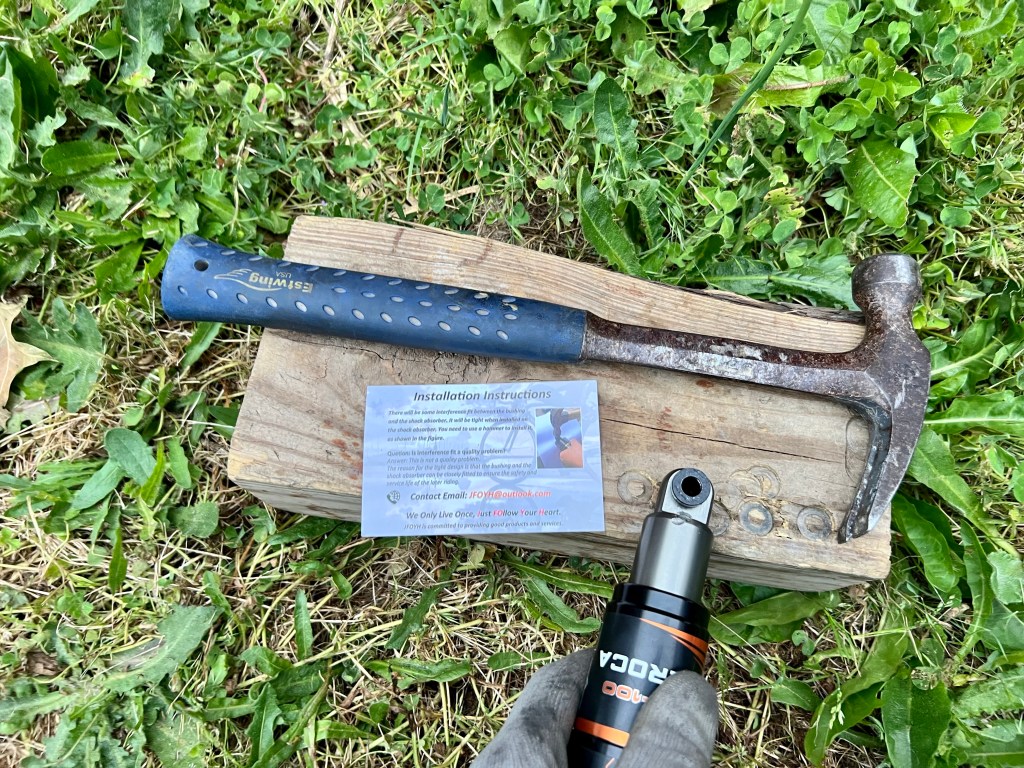 In Aurora, I pick up a cheap replacement shock and meet Kevin (@skytrike_kevin), my host for the night. The replacement shock is heavy and the instruction card in the box tells the user to pound in the bushings with a hammer… because using a rock would have been too crude? The interference fit is so tight that I have to take heavy swings. The end result looks like hammered dog shit but I manage to get it installed and put the spring back in my step.