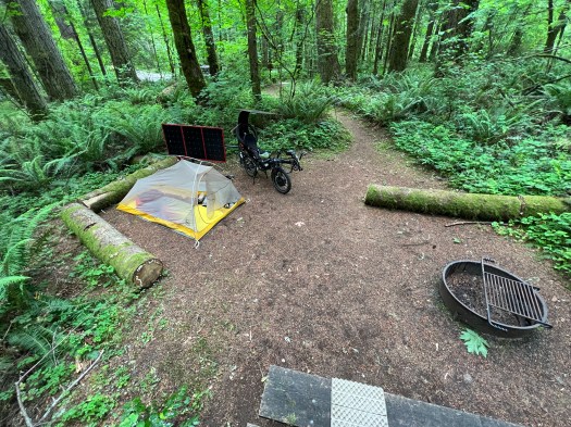 I get an early start out of Portland with a full battery, which is good because it‘s cloudy until late morning. Rob guides me out of the city and we part ways. I ride north 80 miles cross the Columbia River to Seaquest State Park in Washington state. Bye-bye Oregon.