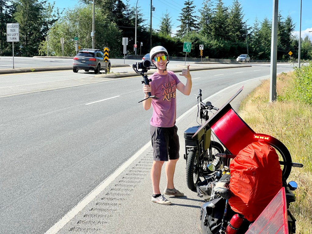 I leave Vancouver, followed by Grin’s videographer, Aaron, who is getting coverage of me riding for their latest YouTube video. This spectacle seems to turn even more heads than the solar bike alone. I pretend that I am comfortable with this kind of attention. A panhandler working an intersection in North Vancouver abandons his post to come over and ask, “Hey, is that the bike from the Grin website?” Aaron can’t believe it. “You’re a celebrity!”