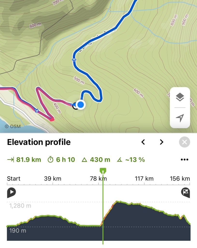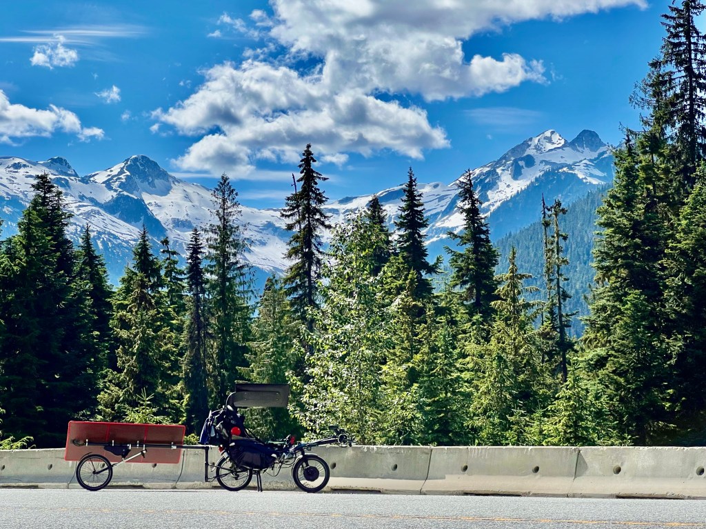 After the prescribed self-isolation period, I continue north through Whistler and Lillooet. I feel weak for a few days but eventually regain my strength. The scenery here is some of the most spectacular of the entire trip. One particular hill has sustained grades of 8% – 14%. I end up having to stop seven times to let the motor and controller cool down while climbing 1050 meters. The 30°C+ temperatures push both bike and rider to their limits.
