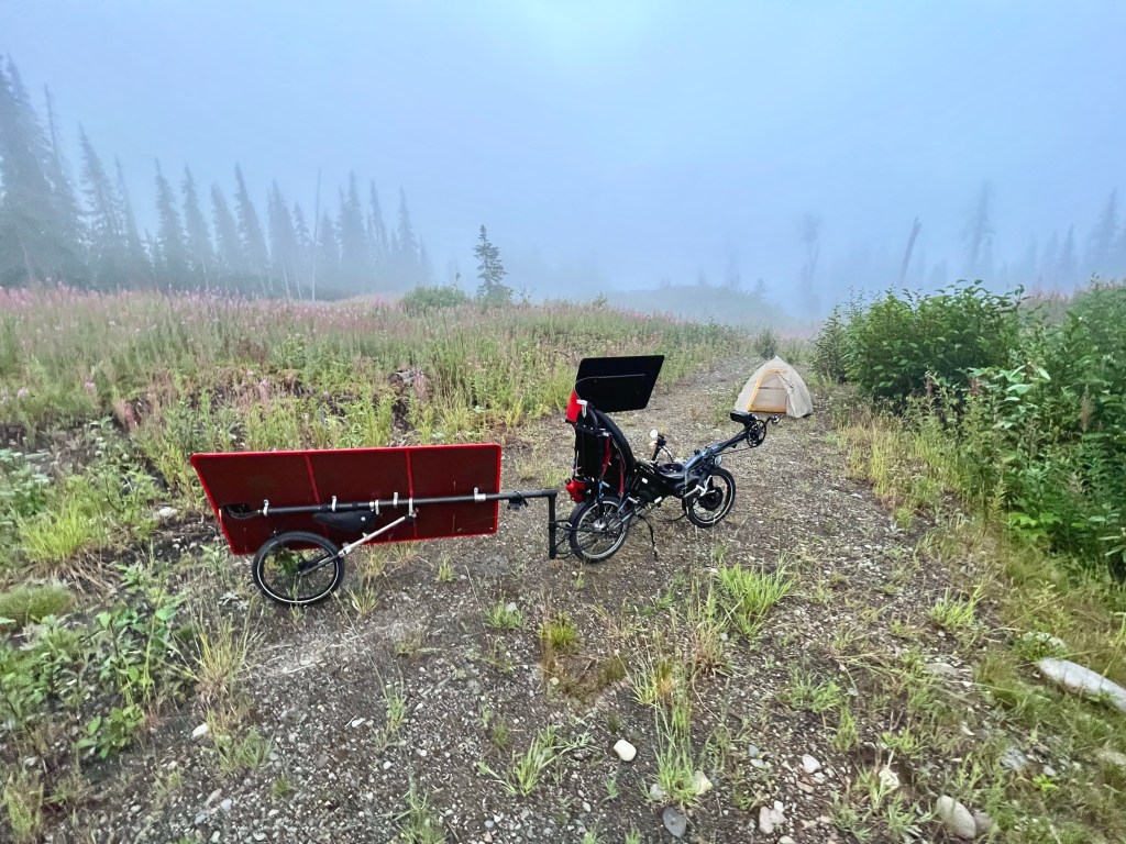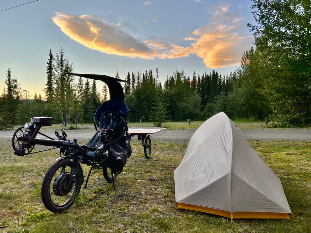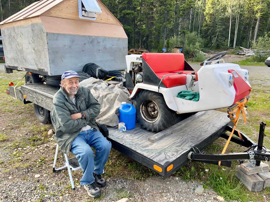 While setting up camp, I meet Robert, a prospector who spent most of his life in the Yukon, looking for gold, copper, and diamonds. He has a unique ATV from the 1970s with a DIY shack on a skidoo trailer that he uses in his trade. He is keen to learn about my solar bike and I’m delighted to learn about his experiences.