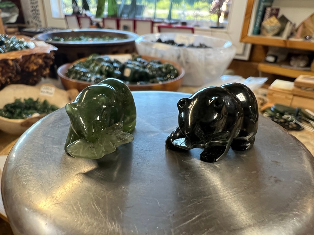 I didn’t expect to buy a rock that I would carry in my panniers on this trip but I end up getting a tiny carved jade bear with a salmon in its mouth. They sure know their clientele. I vaguely remember something about restrictions on bringing jade across international borders so I consider asking Claudia, “Do I need to keister this when I cross into the US?,” but think better off playing this bit on her.