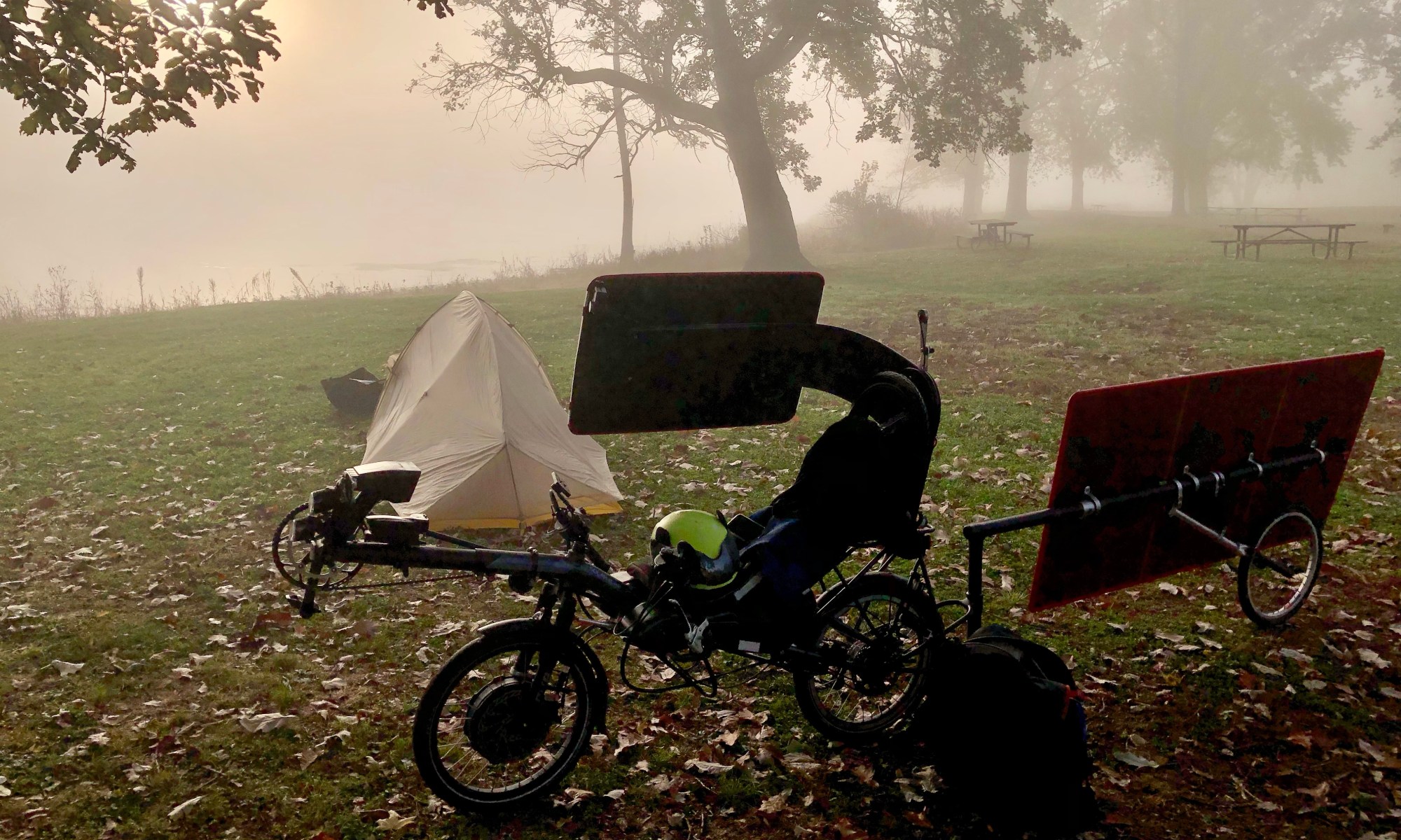 It’s sunny again and looking to stay that way for the next three days. I definitely like cold and sunny better than cold and rainy. I get to talking with another recumbent rider on the bike trail and he comes around to asking me where I’ve been sleeping at night. It turns out he is …